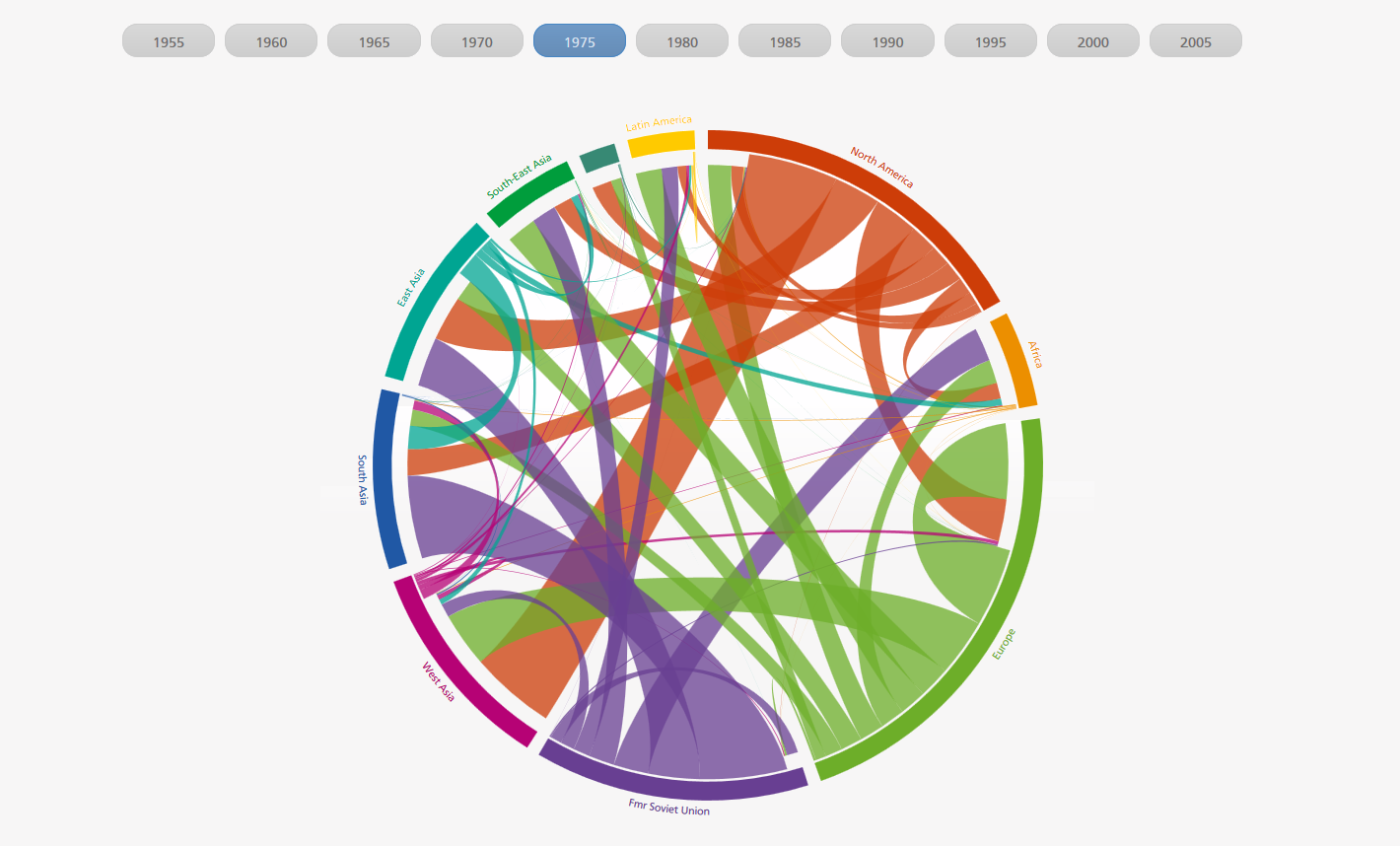 Each visualization can be accessed by clicking on the buttons marked by years. The default visualization is by region, of which there are 10. By hovering the mouse over each region it is possible to see the aggregated flows between the regions. The amount of trade can also be seen by hovering the mouse over the chord connecting two regions. Amounts are expressed in US dollars. To go one level lower and explore the flows at the country level you can click on a segment (region name) to switch between country and region view. To go back to country view click on any country within the region.